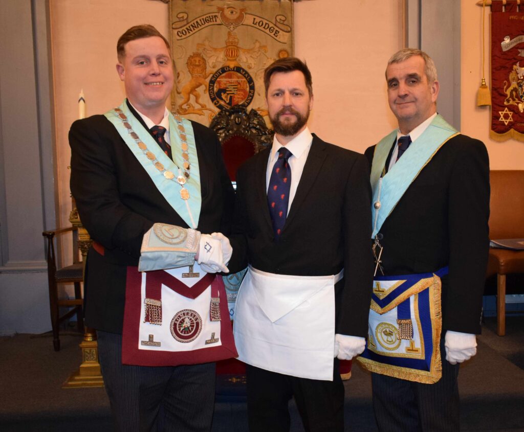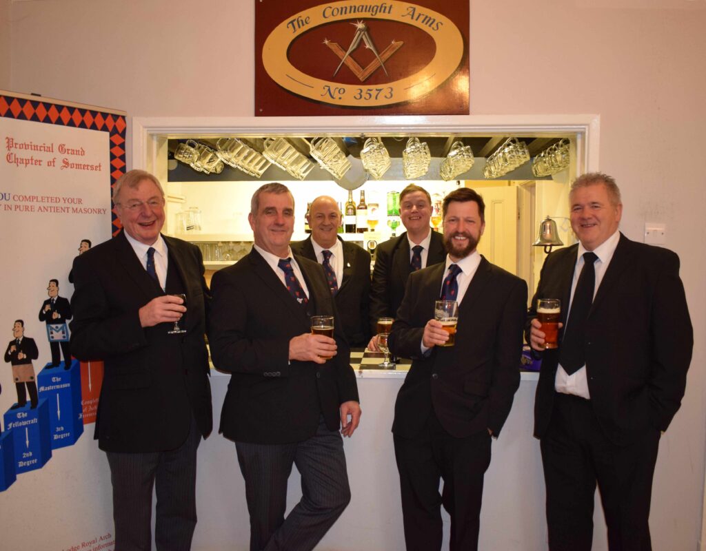 During the ceremony he was confidently escorted by the Junior Deacon Bro. Neil Sunderland who also explained the ’Fire’ to the Initiate at the following Festive Board. Once all the formalities were over Bro. Jefferies enjoyed a celebratory drink with some of his new found brethren at the Connaught Arms.
