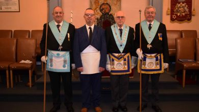 W. Bro. Adrian Moore presented the Exhortation to the Candidate in an exemplary manner. Junior Warden, W. Bro Craig Harding followed with an explanation of the Fifteen Fellow Crafts, who also gave The Charge, then entrusted the Candidate with the Secrets of the Degree. An excellent explanation of The Traditional History was given by W. Bro. Tony Cooper. The Ceremony was completed by the Third-Degree Working Tools presented by W. Bro Jeremy Hann.