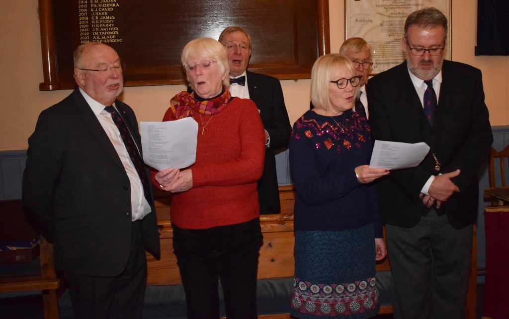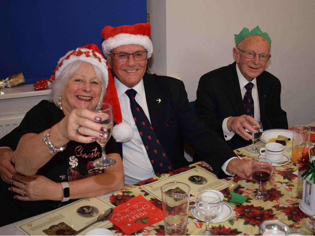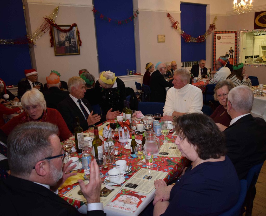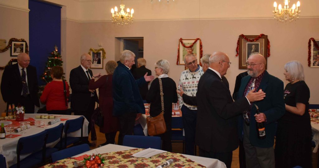 With voices suitably lubricated we all went up to the Temple, that was dressed with garlands and candles (battery operated to keep the ‘Safety Elves’ happy), for Carols and Readings humorously led by W. Bro Adrian Moore. Then back to the dining room for a traditional Christmas Dinner.