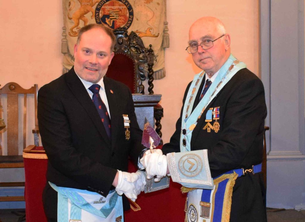 Next, W. Bro Ian Roger, Worshipful Master of the Royal Somerset Lodge No 973, (our Mother Lodge), accompanied by a large posse of brethren, presented the Travelling Trowel to our WM Chris Brooke, who was entrusted in taking the Trowel to the upcoming Provincial Annual Meeting in April.