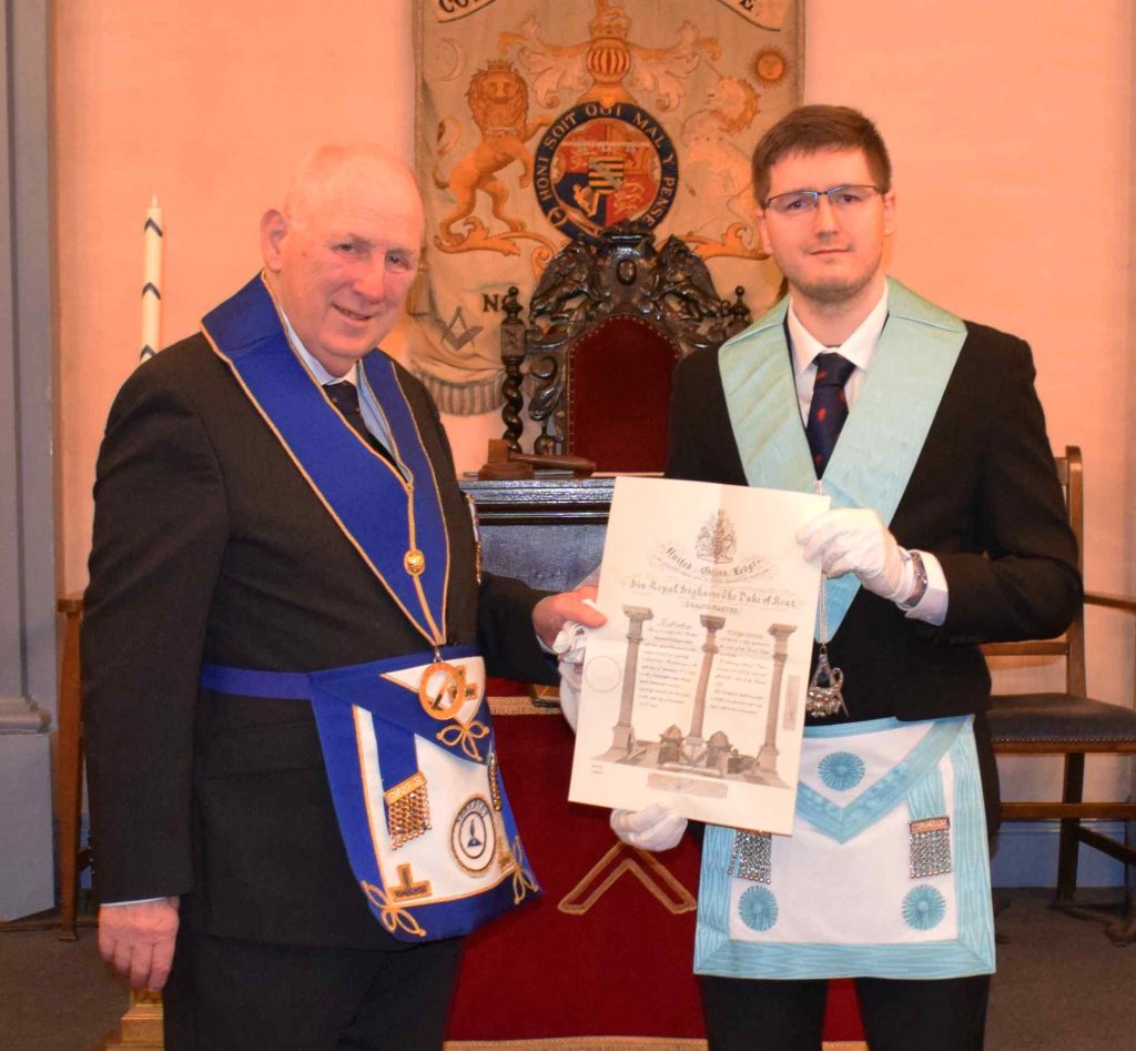 Following a pure ballot the Lodge was pleased to welcome W. Bro David Sherborne as a re-joining member, having been previously proposed in open Lodge by W. Bro. Tony Cooper. The Provincial Grand Mentor, W. Bro Ray Conneely (representing the Provincial Grand Master), then presented a Grand Lodge Certificate to Bro. Mitchell Pimm.